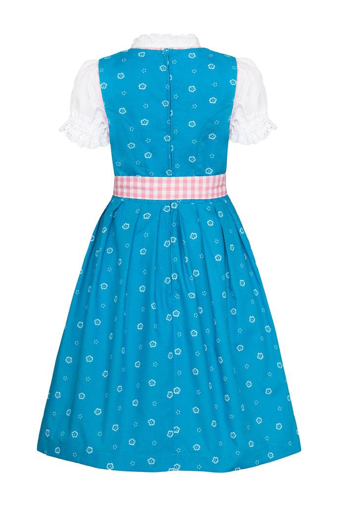 Das Kleid zeigt sich in einem frischen Türkisblau mit weißen Blümchenmotiven und süßer Schnürung am Mieder. Dazu passt die rosa-weiß karierte Schürze, die mit einer großen Schleife gebunden wird und dem Outfit einen verspielten Akzent verleiht. Abgerundet wird der Look durch die weiße Bluse mit Rüschenkragen und Puffärmeln, die den traditionellen Trachtenstil unterstreicht.