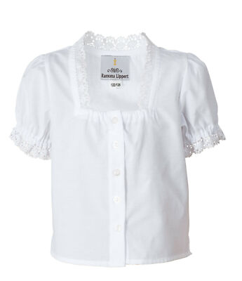 Die weiße Bluse mit Puffärmeln und süßer Spitzenbordüre ist im Lieferumfang enthalten. Durch die durchgehende Knopfleiste lässt sich die Bluse bequem an- und ausziehen.